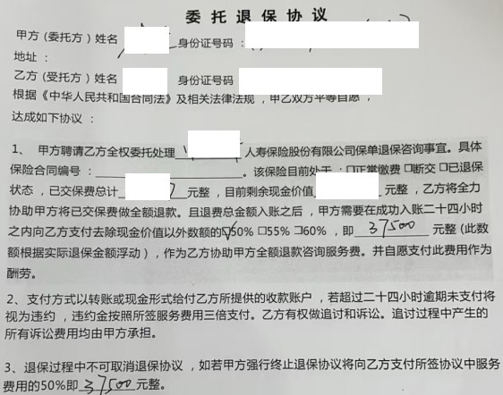 起初,李先生與所謂的“某律師”簽訂了一份委托退保協(xié)議,并聽(tīng)從對(duì)方的要求編造虛假理由多方投訴保司。太平人壽工作人員多次邀約客戶面談但均被回絕,為取得客戶的信任,公司申請(qǐng)當(dāng)?shù)氐娜嗣裾{(diào)解委員會(huì)出面調(diào)解。在調(diào)解過(guò)程中,公司工作人員指出了該委托退保協(xié)議中存在的明顯漏洞——無(wú)論退保成功與否客戶都需向?qū)Ψ嚼U納一筆近4萬(wàn)元的手續(xù)費(fèi)。隨后當(dāng)客戶撥通電話質(zhì)問(wèn)這位“律師”時(shí),對(duì)方果然原形畢露,并威脅將依據(jù)該協(xié)議內(nèi)容上門(mén)追討。最終,客戶選擇報(bào)警處理,同時(shí)感謝太平人壽和調(diào)解員的耐心勸導(dǎo),并辦理了保單復(fù)效手續(xù)。