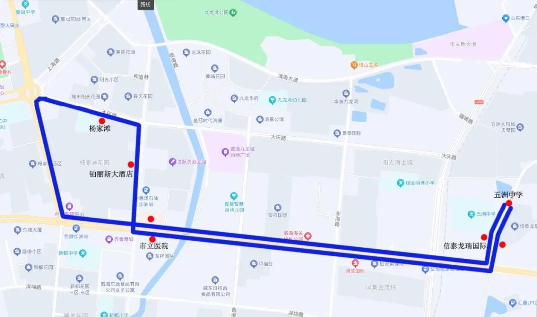 由楊家灘站點始發(fā)(大慶路北側(cè)),途經(jīng)大慶路、海濱南路、齊魯大道、城子路、齊魯大道、黃海路、大慶路至楊家灘。