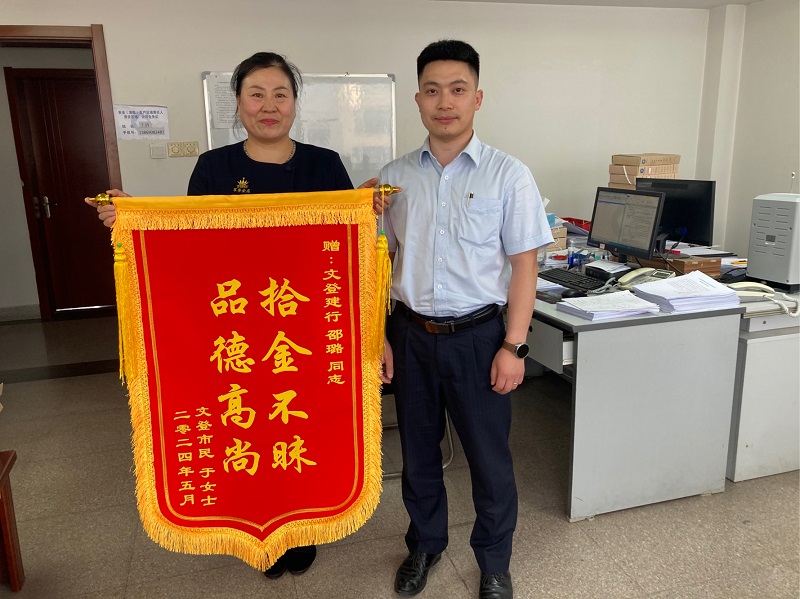 5月14日下午,于女士帶著一面錦旗來到建設銀行威海文登支行,詢問邵璐是否在這里工作,要當面感謝邵璐經理。經過于女士的講述,原來她的手機于上5月12日晚聚餐結束后丟失在路邊,而自己并未發(fā)覺。邵璐撿到手機后,在鎖屏照片里發(fā)現于女士工作的店名,繼而搜索到該店的抖音號,通過老板聯系到于女士家屬,于女士這才得知自己手機丟失。